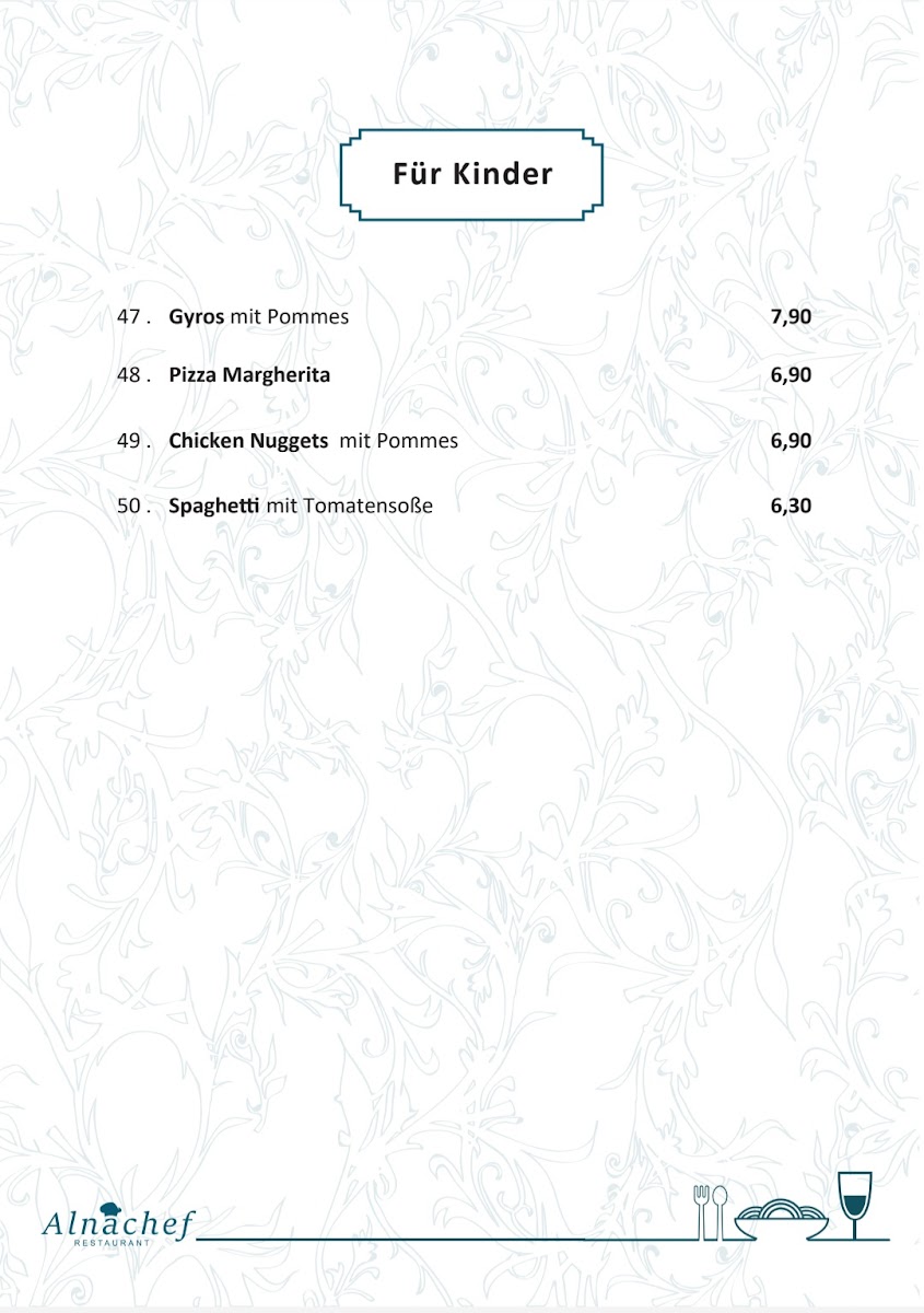Welcome to Alnachef Restaurant, a hidden gem nestled in Hannover, Germany. This delightful family-run establishment offers a cozy ambiance that's perfect for anyone seeking authentic home-cooked dishes. The menu showcases a variety of delectable options, from tabbouleh to oven-baked aubergine with cheese and savory grilled meats, accommodating both meat lovers and vegetarians alike.